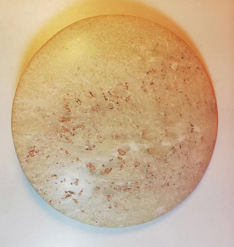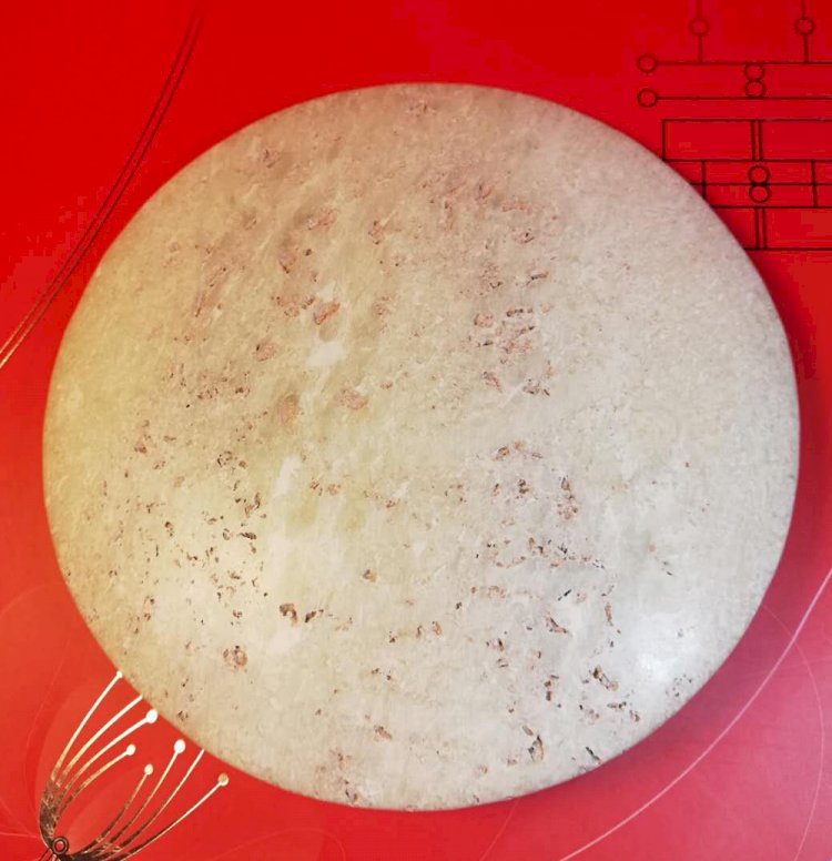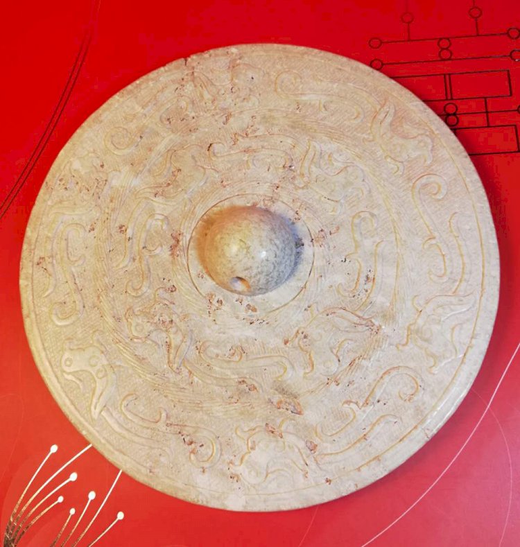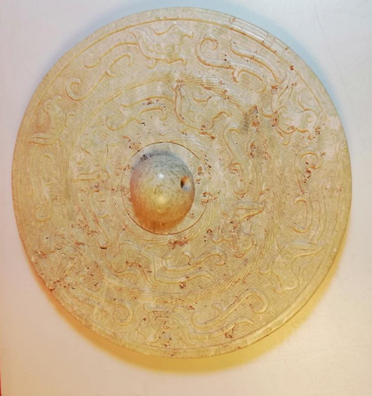 這白玉鏡,己鈣化,圓卜身,中央一半球形突出而有孔可穿,接著一圈光素地子,是一圈扭絲紋飾,在全器小斜格紋地子上,內圈一周淺浮雕四鳳紋;又隔一圈扭絲紋,則淺浮雕稍大之六鳳紋作外圓紋飾;璧邊為一光素凸稜,而棱中間稍微內凹為飾。全紋飾皆戰國流行之典型者 ,裝飾藝術很強!背面為光潔平滑之圓凸面,是實用之玉鏡鑑容面。