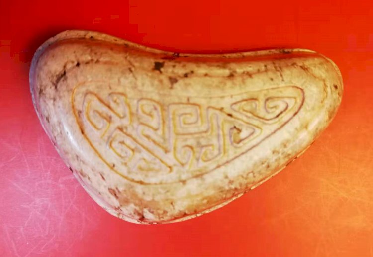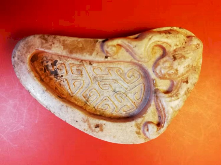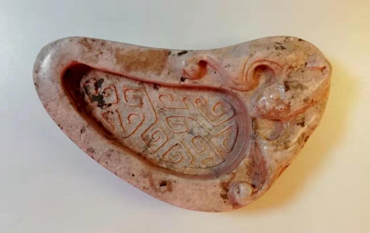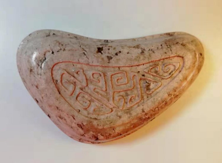 E59戰國 近半月形螭紋雲紋玉珮 (長:5.72cm,寬:3.45cm)一面:雕陽綫之雲紋;背面:較大一端浮雕一螭紋,背身凹處亦雕陽綫之雲紋,凹處較細端內有一穿,可作佩飾。