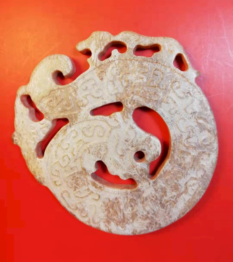 這近似圓璧形之捲尾龍,龍尾上出廓雕一奇異獸,對龍尾虎視眈眈!而尾之另一端却有一圖案化似的異獸,張口咬着龍尾,此似為漢代後世所謂之「咬尾龍」開創先河!