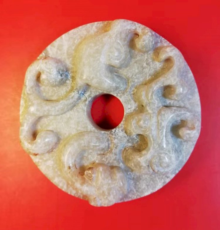 一面:高浮雕子母螭;另一面:浮雕四個圖案化S紋,將璧底上所雕的陽綫之雲紋,分隔成四份為裝飾,構思奇特,此皆戰國之風格使然!