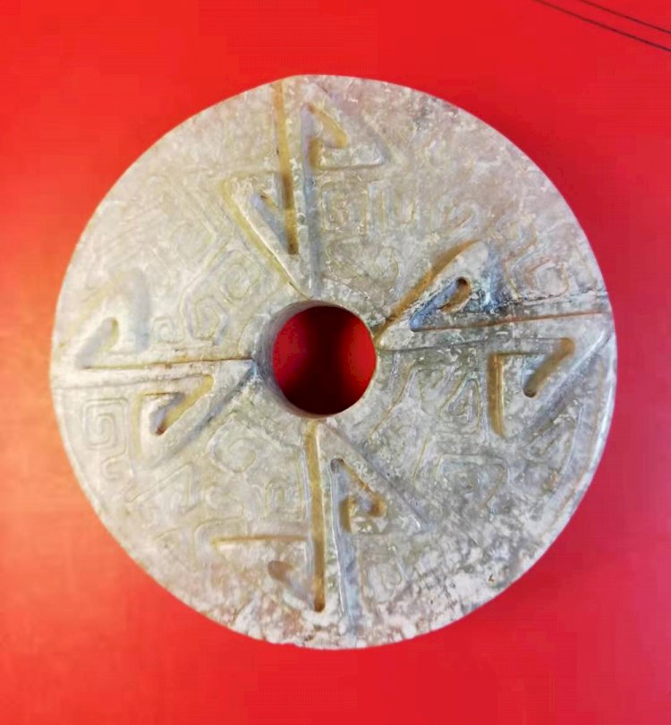 一面:高浮雕子母螭;另一面:浮雕四個圖案化S紋,將璧底上所雕的陽綫之雲紋,分隔成四份為裝飾,構思奇特,此皆戰國之風格使然!