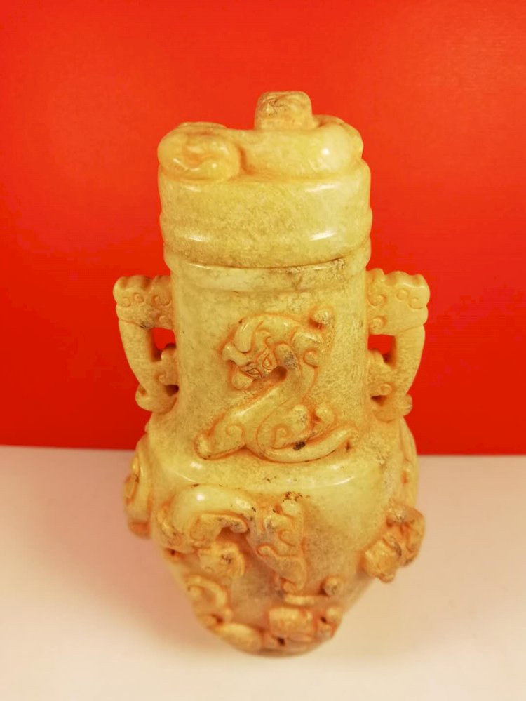 G020. 漢代有蓋九龍螭玉耳瓶(高:18.60cm,最寬:9.12cm)