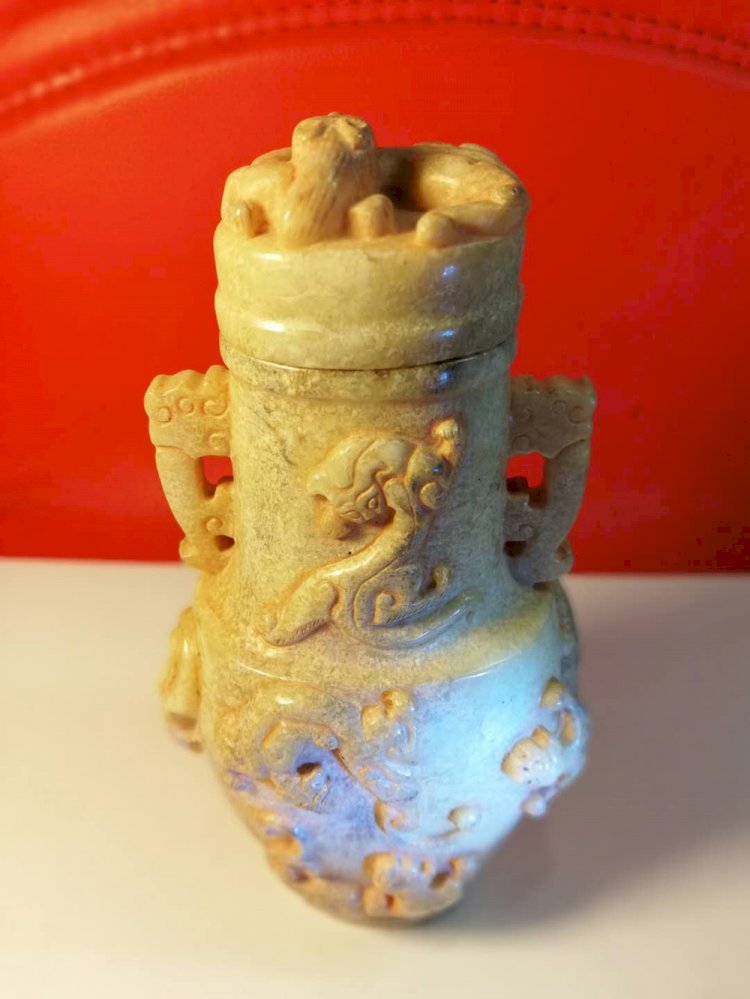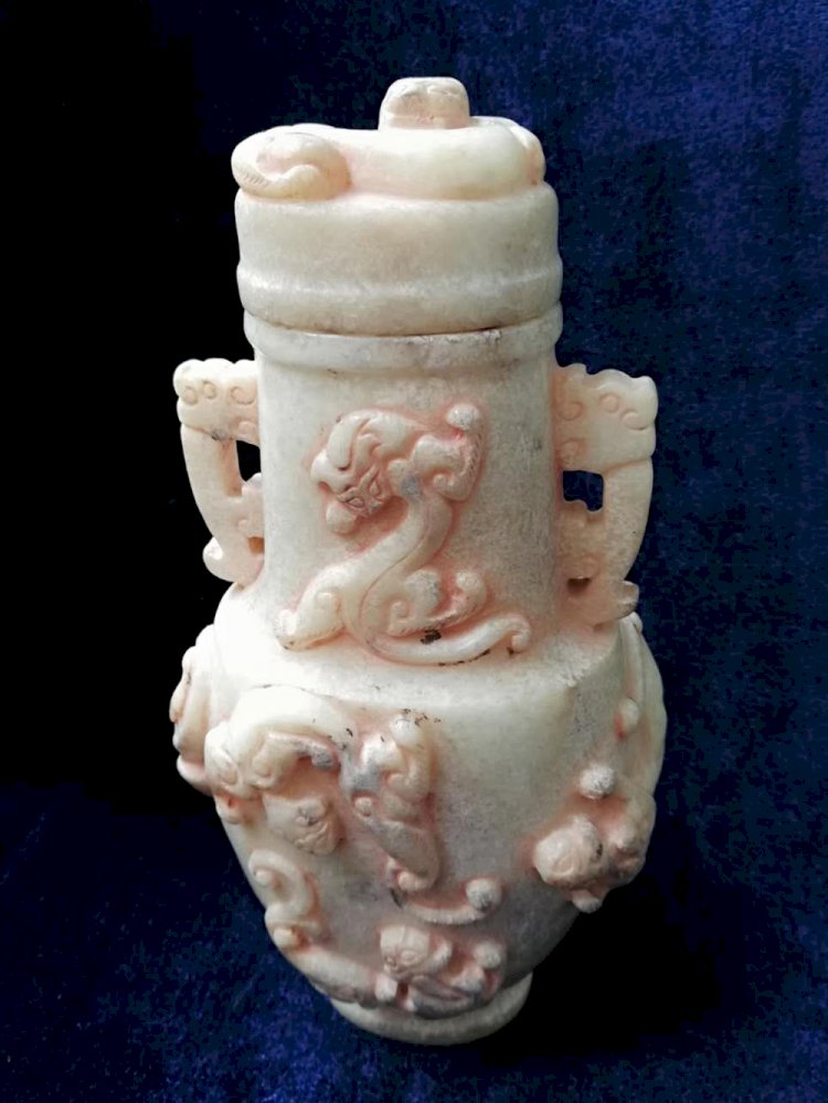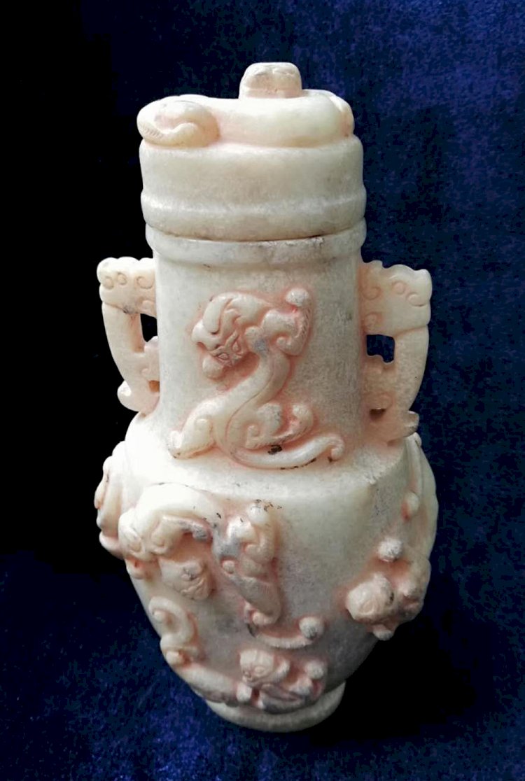 玉質較佳,近似白色,微有黃土沁色。蓋頂有一高浮雕螭,瓶身有八隻高浮雕龍螭,共九龍螭是為漢代皇家最喜愛的紋飾,也許喻意皇族為龍衍生的後代,天子就是龍子,是應統治天下之意屬矣!玉瓶肩部兩側各飾一龍形為耳,也屬配合並加強此種之氣勢,為皇家之威勢效勞!