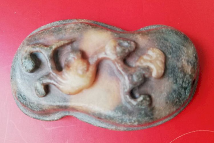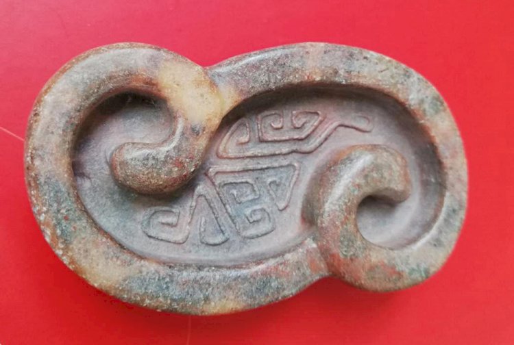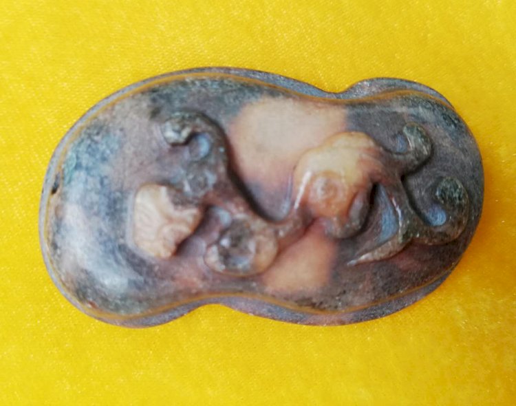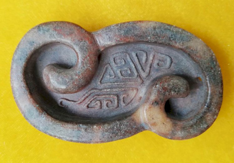 通體銀灰色沁,器面高浮雕一螭;底凹面處雕陽文的雲紋。一端有一孔可穿佩。