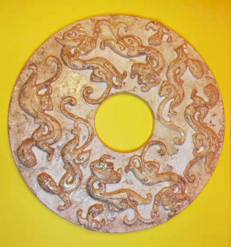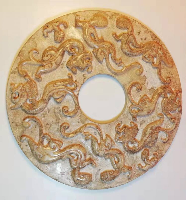 一面:浮雕1O隻螭龍(亦稱螭虎,古代傳為龍生九子之一),八隻大,二隻半身小螭相對在璧之邊緣上,螭身S形,是漢代著稱的曲線弧度優美之紋飾。
