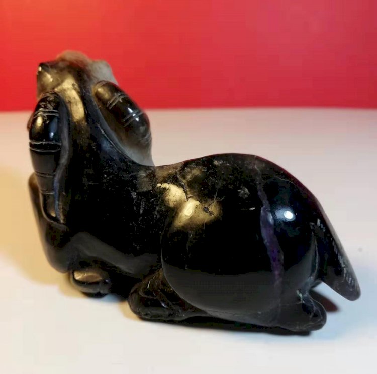 玉質瑩潔光潤;雕工精美,曲度圓勁優美,頭偏向右,左邊身軀幾全部覆蓋有整片狀之水銀沁,如此大面積的水銀沁,前所未見,極其珍罕,而羊底部亦大部分有水銀沁。