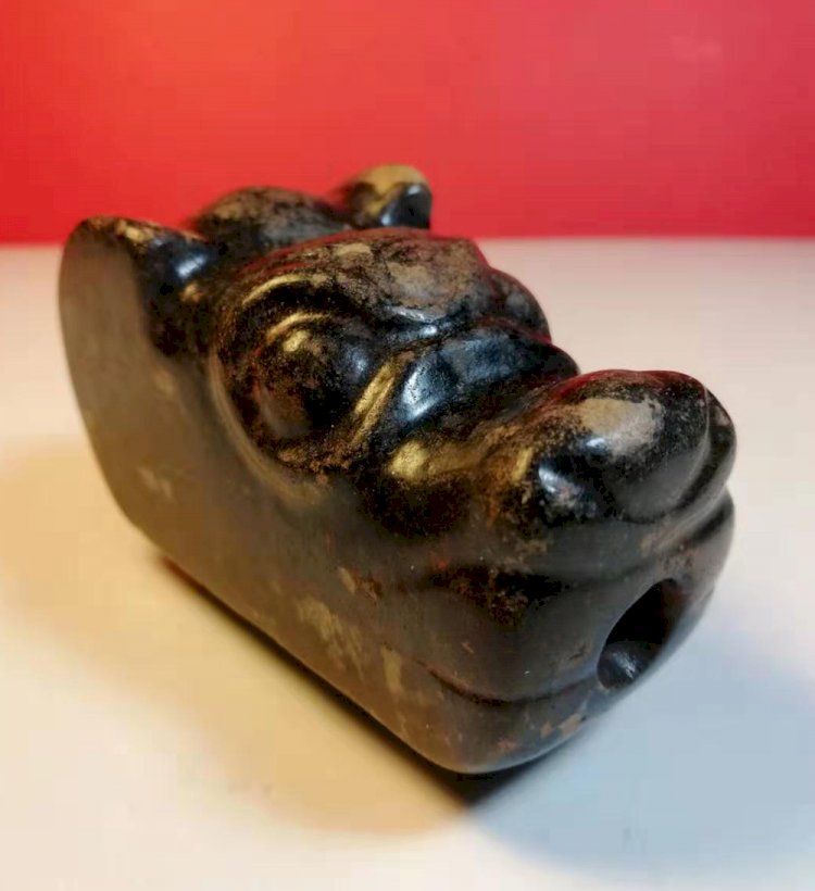 這墨玉犬首:玉質堅密,黑光如漆,古味濃馥,形態古拙;雙目圓睜有神,鼻突起,雙耳聳起,似醒覺靈敏,氣韻生動,造型豐滿,極富神韻,栩栩如生,似在守護之莊嚴中,盡忠職守!口至頸後有一通心穿,可佩在身,似覺有一通靈義犬護身,(古代墨玉稱「玄玉」,認是最佳僻邪擋煞之物)。
