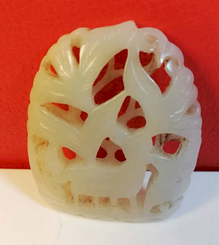 此器為雙層鏤空雕:一回首芝角鹿安逸在山林中貢食,山林枝葉茂盛而寧靜。   雕工:清新簡潔而樸雅,芝首鹿回首覓食,頗為神似,此為靜中寓動的典型作品,亦為遼金玉雕中感到清靜的特色之一,這尤勝過份炫耀的繁縟工藝,為現世清靜難得一見的珍罕之品!