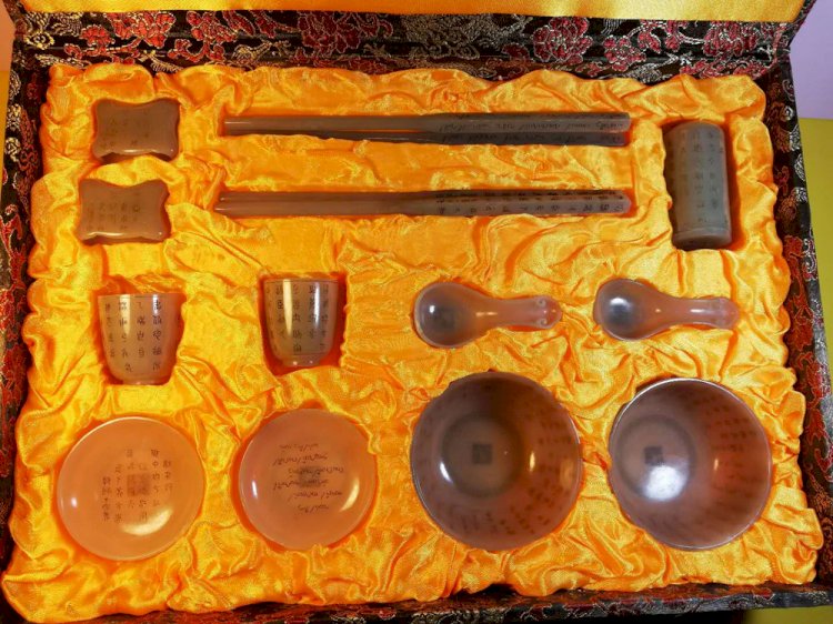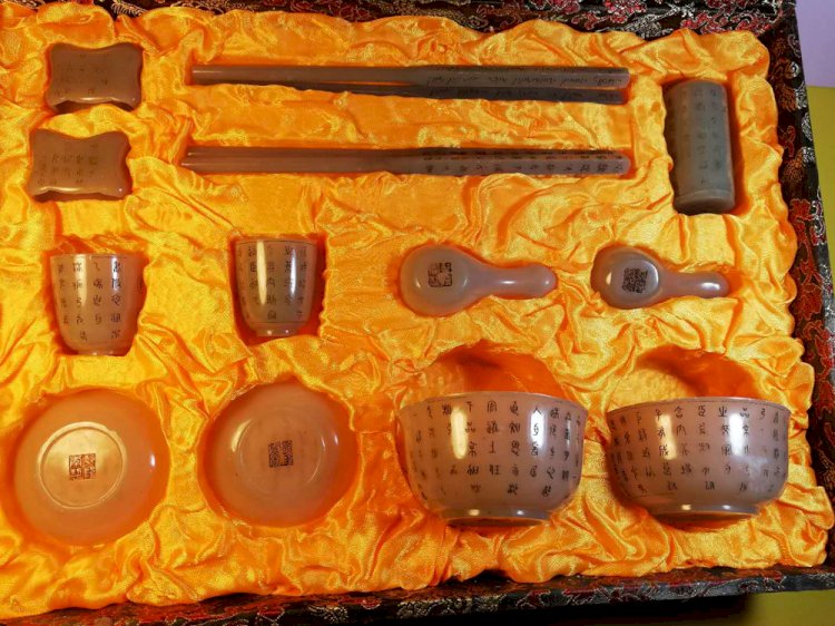 此極珍罕食具是乾隆特意,專心製造,作為公主嫁粧之一,每件皆精刻漢文、滿文,一雙碗底還雕有「 乾隆年製」底款。 此極精緻之漢文、滿文在此皇室重大婚嫁上,同時並用,顯示漢滿是一家,此極深具重大的歷史意義,是為暖和種族矛盾之良好表現!如此數量極少之珍罕實物再度現世,真是難能可貴至極,誠望有福緣之善心承傳者能更愛惜之!!